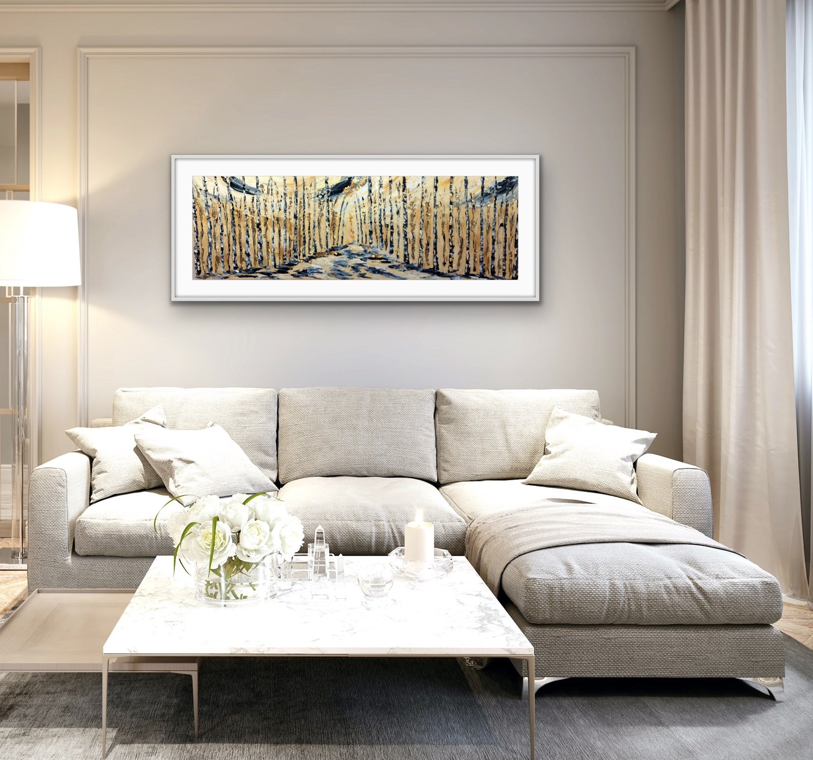 original oil palette knife painting Deep canvas size 40cm x 120cm framed in a deep white wood floated frame frame size 60cm x 140cm