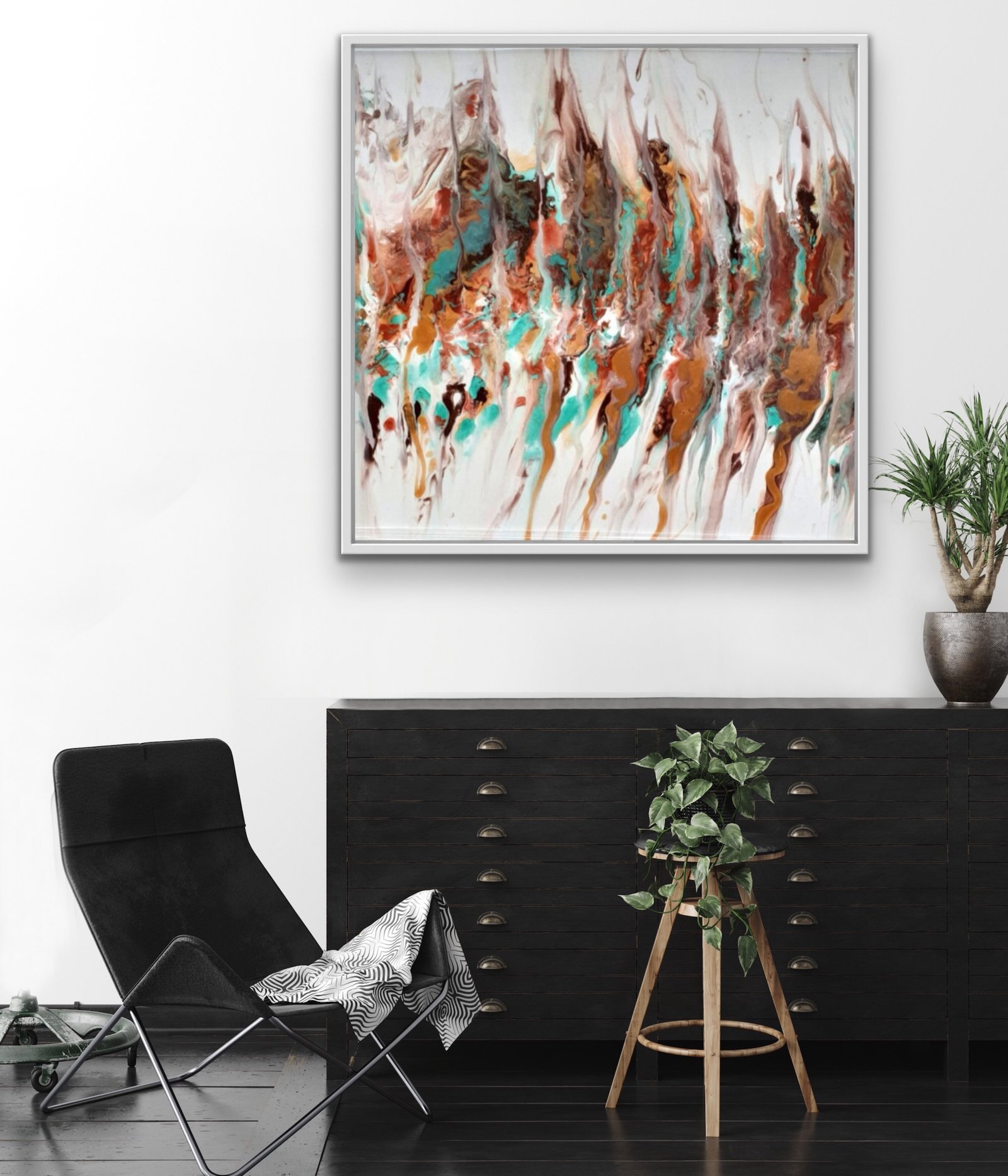 ORIGINAL ACRYLIC POUR FRAMED IN A DEEP WHITE WOOD SLIP FRAME