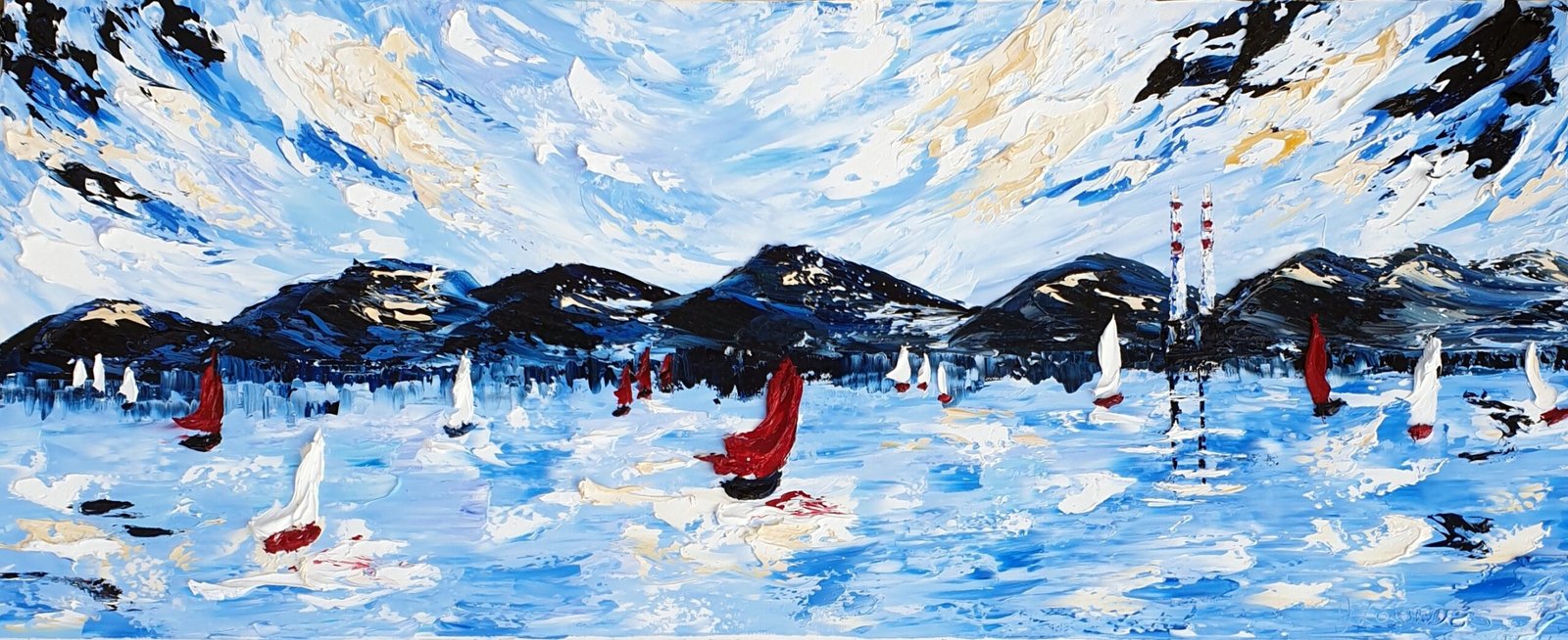 This original oil palette knife painting is inspired by the beautiful Chimney stacks of the Power Station. You either love them or hate them. I love them. I feel you know where you are they are a landmark. I have a facination with them and you will notice I paint them quite a lot. I love driving to the Red Stables along the Sea Front to St Annes Park. I cannot wait to see the skyline the sky the colours. Its always different no matter how many times your take that drive. I love that. This particular palette of colour I call my Lovers Sea palette. It is very romantic with the mauve and teal accents. The beautiful yellow ochres lend itself to a very rich and dreamy painting. Its size is impressive XXL