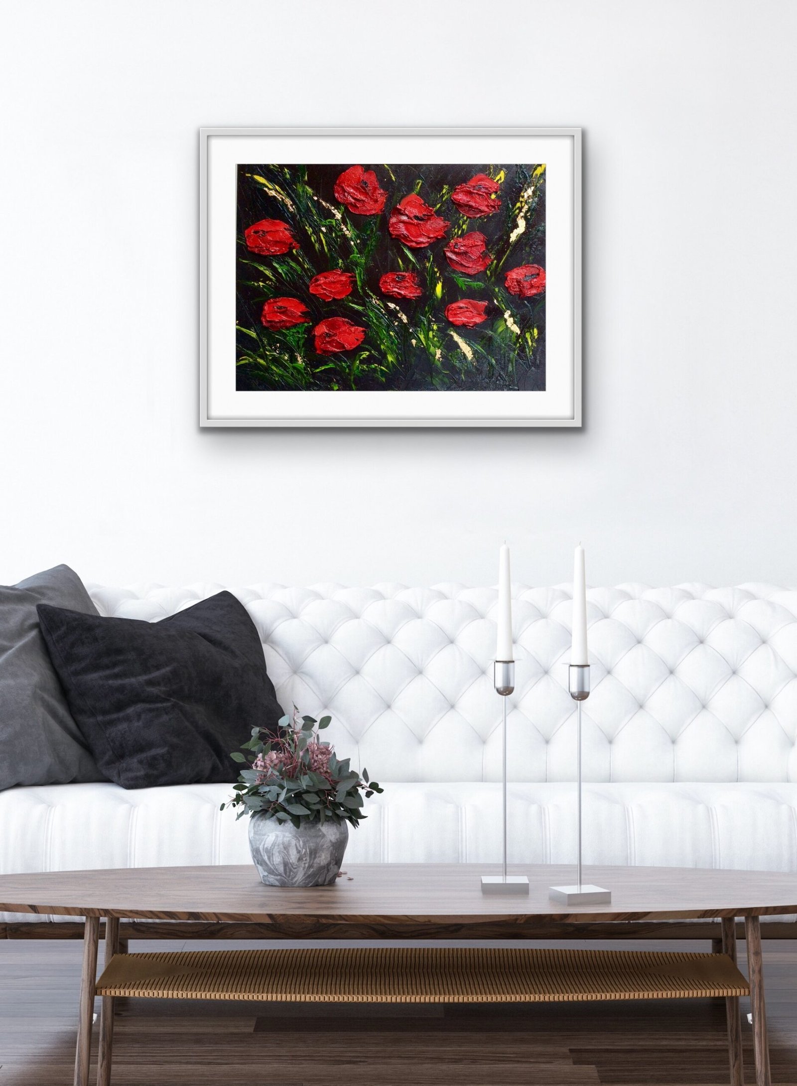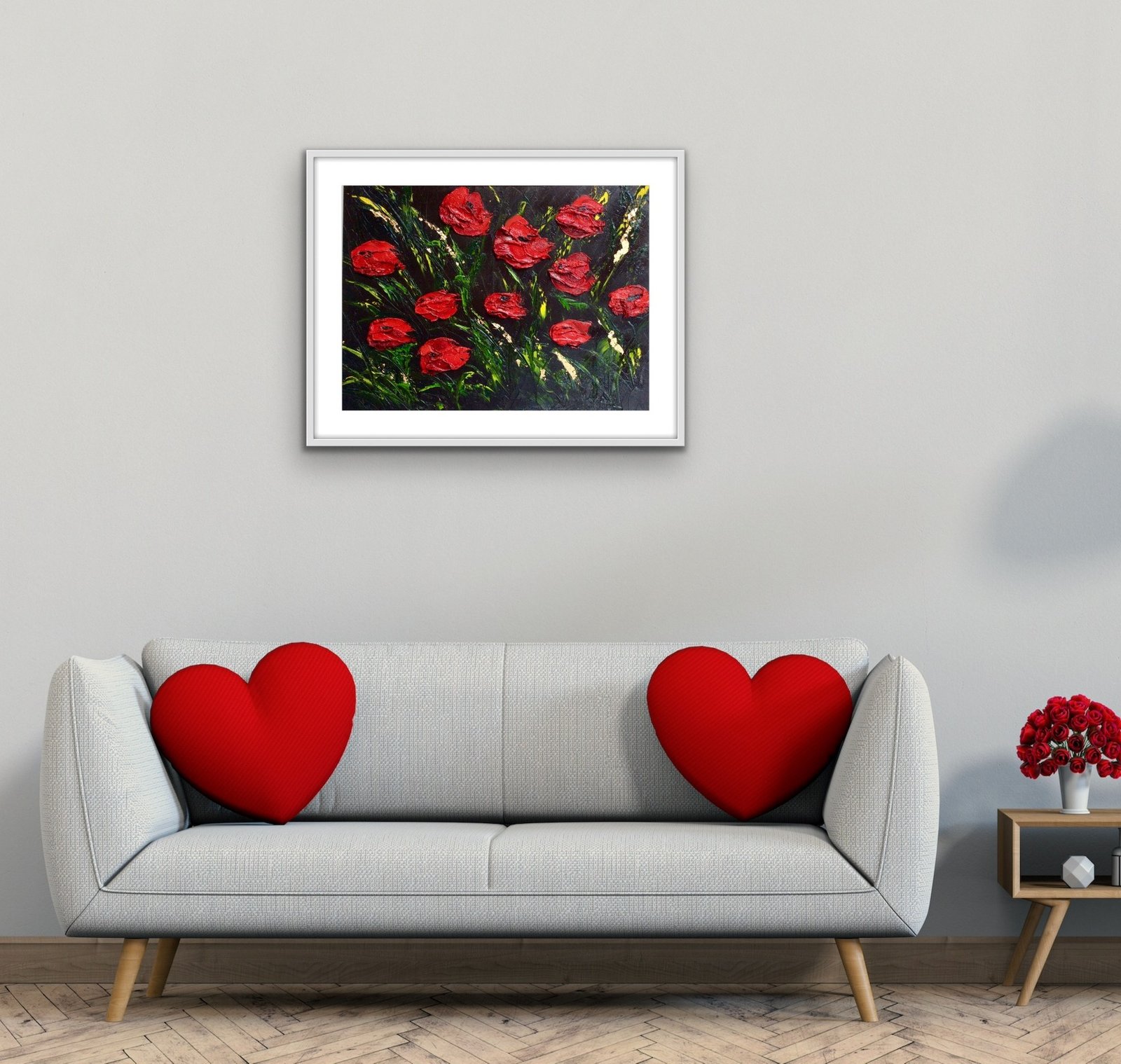 This original oil palette knife painting is inspired by the memory of the fields of red tulips that grew beside me when I moved to my first house . The local family grew flowers it was their family business. I didn't even paint then its over 30 years ago. The fields are now filled with houses but I will always remember the fields of beautiful Red flowers. I used artistic licence and painted poppies. I love this impressive xxl painting