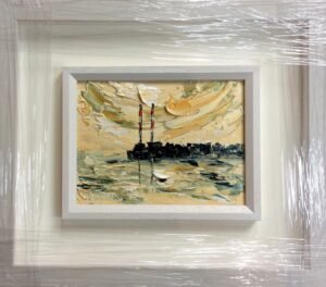 This original oil palette knife painting is inspired by the beautiful Chimney stacks of the Power Station. You either love them or hate them. I love them. I feel you know where you are they are a landmark. I have a facination with them and you will notice I paint them quite a lot. I love driving to the Red Stables along the Sea Front to St Annes Park. I cannot wait to see the skyline the sky the colours. Its always different no matter how many times your take that drive. I love that. This particular palette of colour I call my Lovers Sea palette. It is very romantic with the mauve and teal accents. The beautiful yellow ochres lend itself to a very rich and dreamy painting. Its size is impressive XXL
